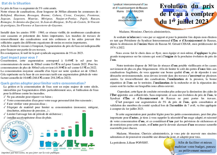 Le SIAE de Rauzan vous informe de l'évolution de la tarification de l'eau cette année et de son…