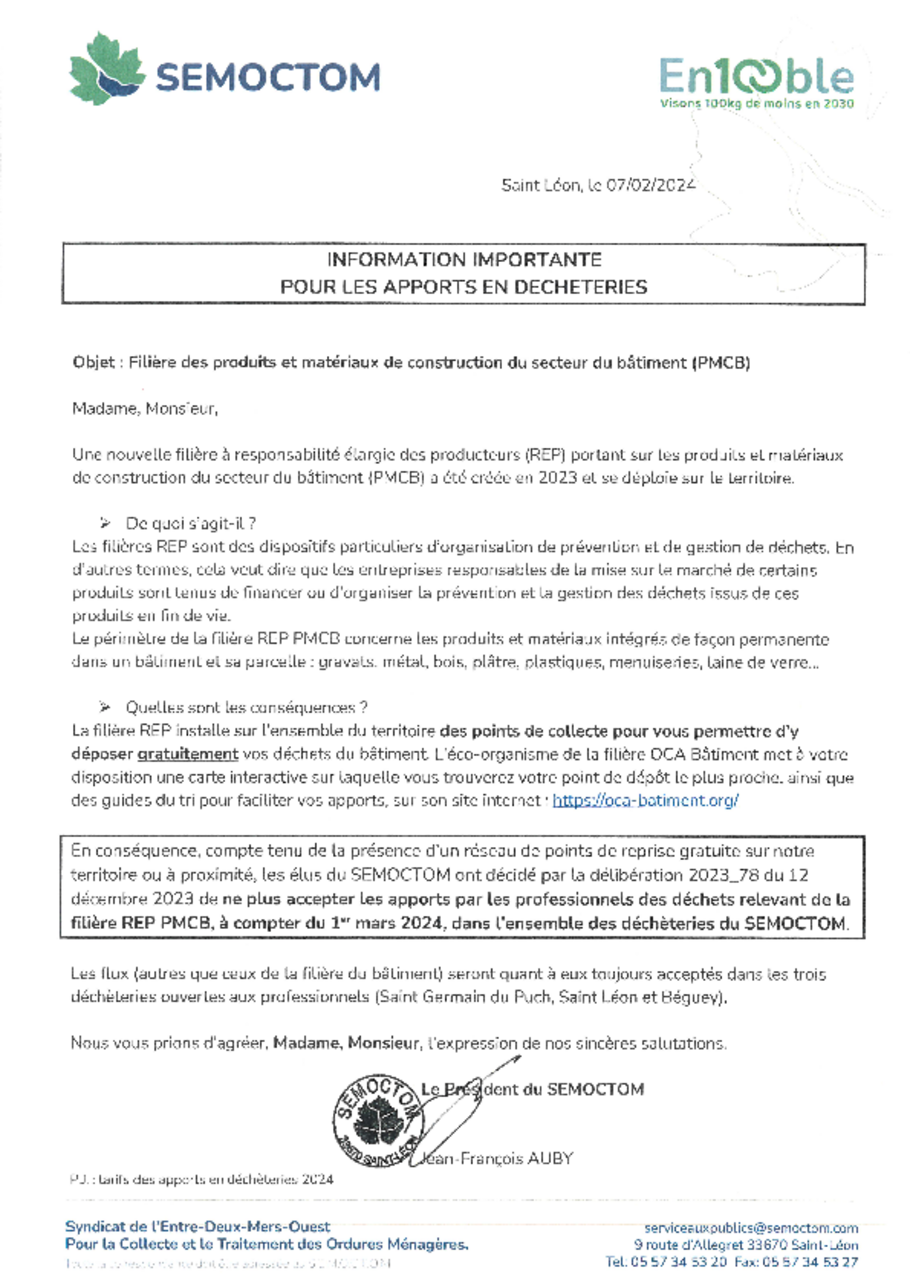 SEMOCTOM : fin de prise en charge des déchets du bâtiment