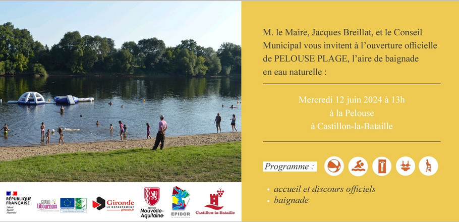 La saison estivale approche !! Jacques Breillat, Maire de Castillon-la-Bataille, vous invite à inaugurer Pelouse Plage. Le 12/06/2024 Retour